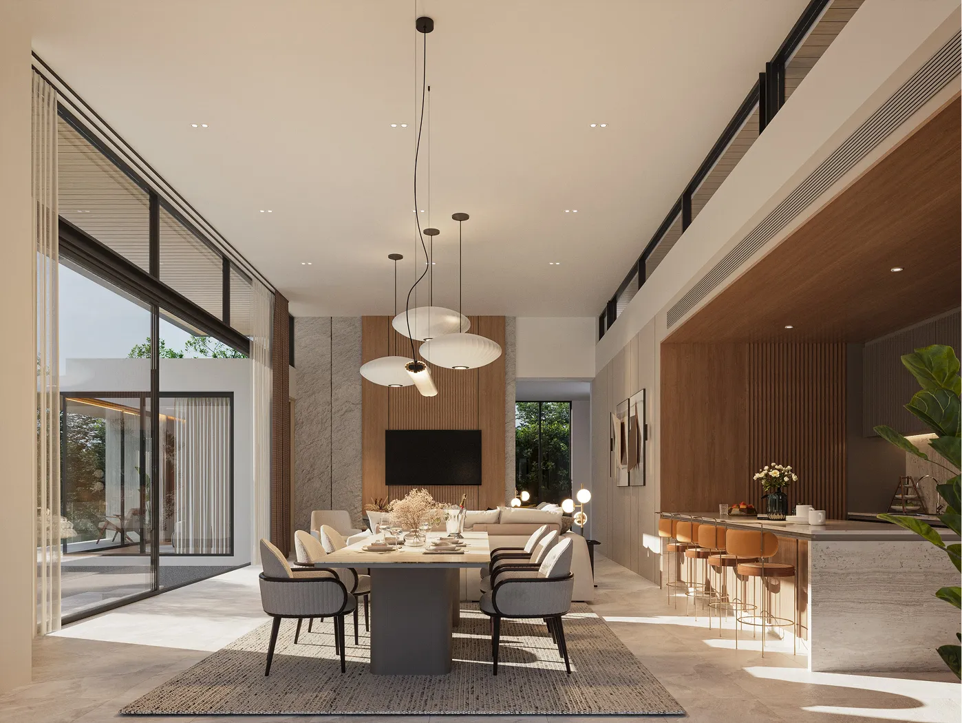 • Contemporary tropical architecture with panoramic windows, open spaces, and premium materials.