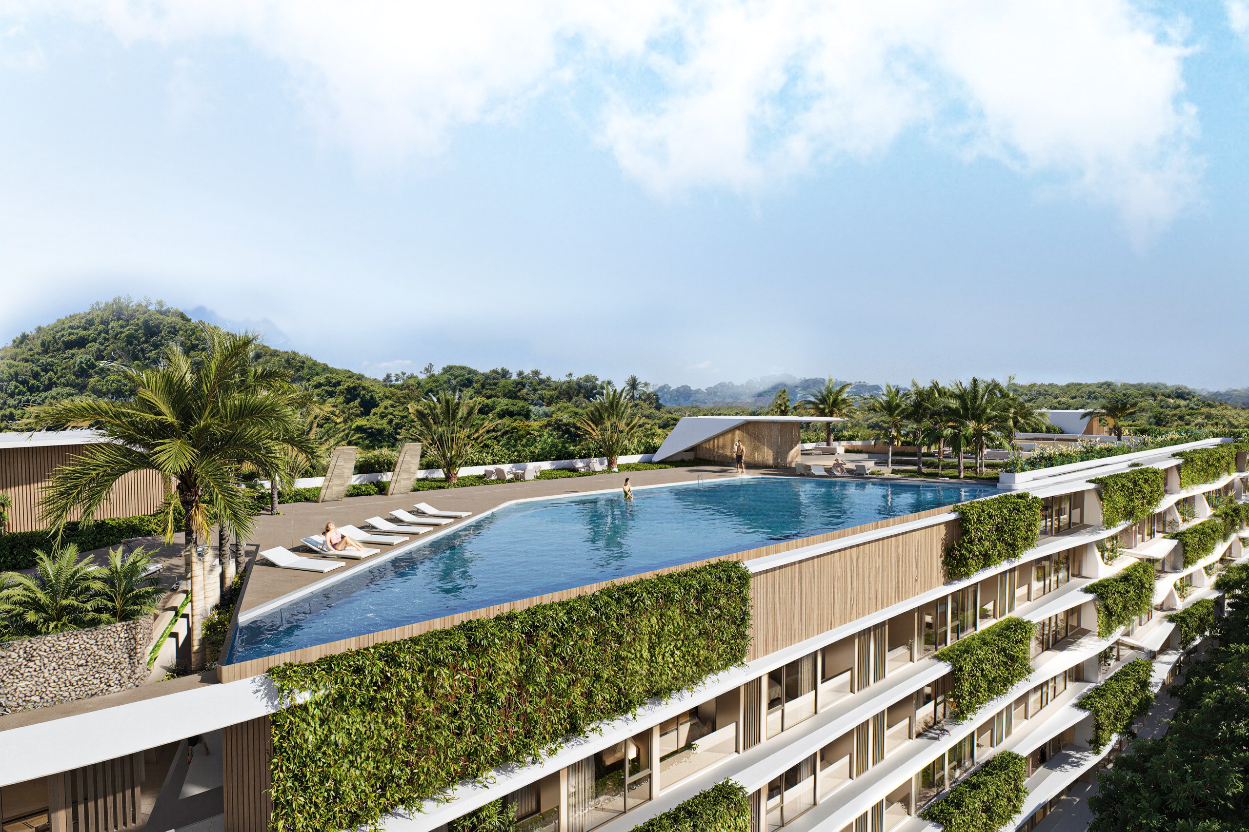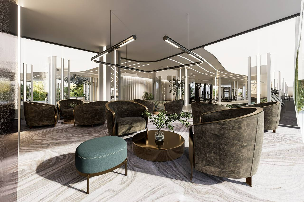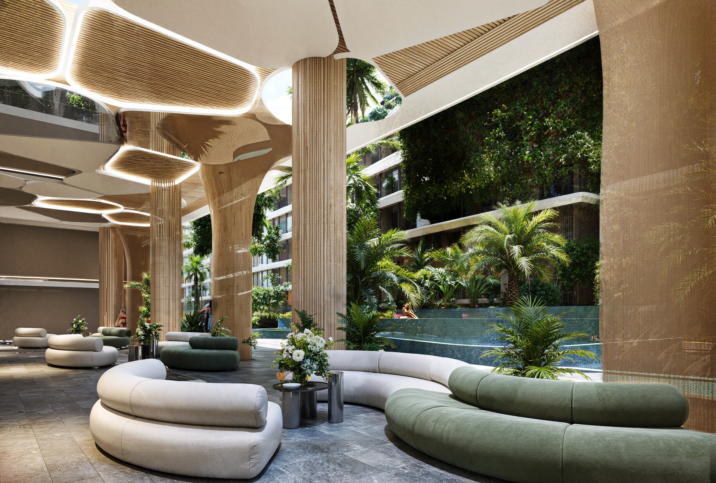 The complex features an extensive range of amenities, including a restaurant, yoga room, children’s center, large aqua zone, three rooftop infinity pools, a gym, coworking space, and underground parking.