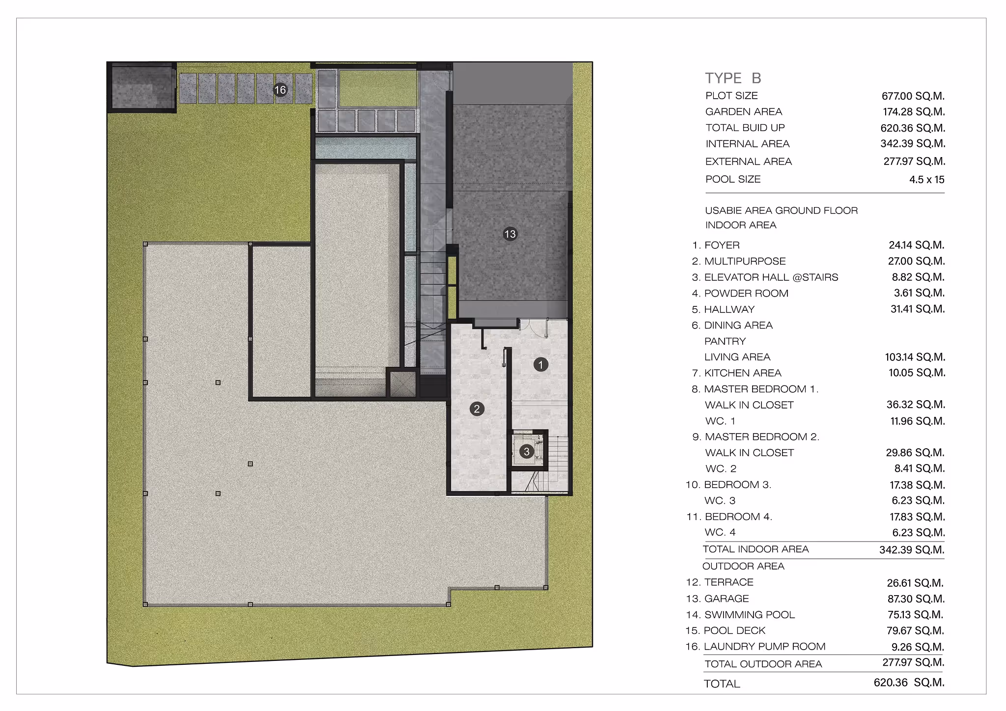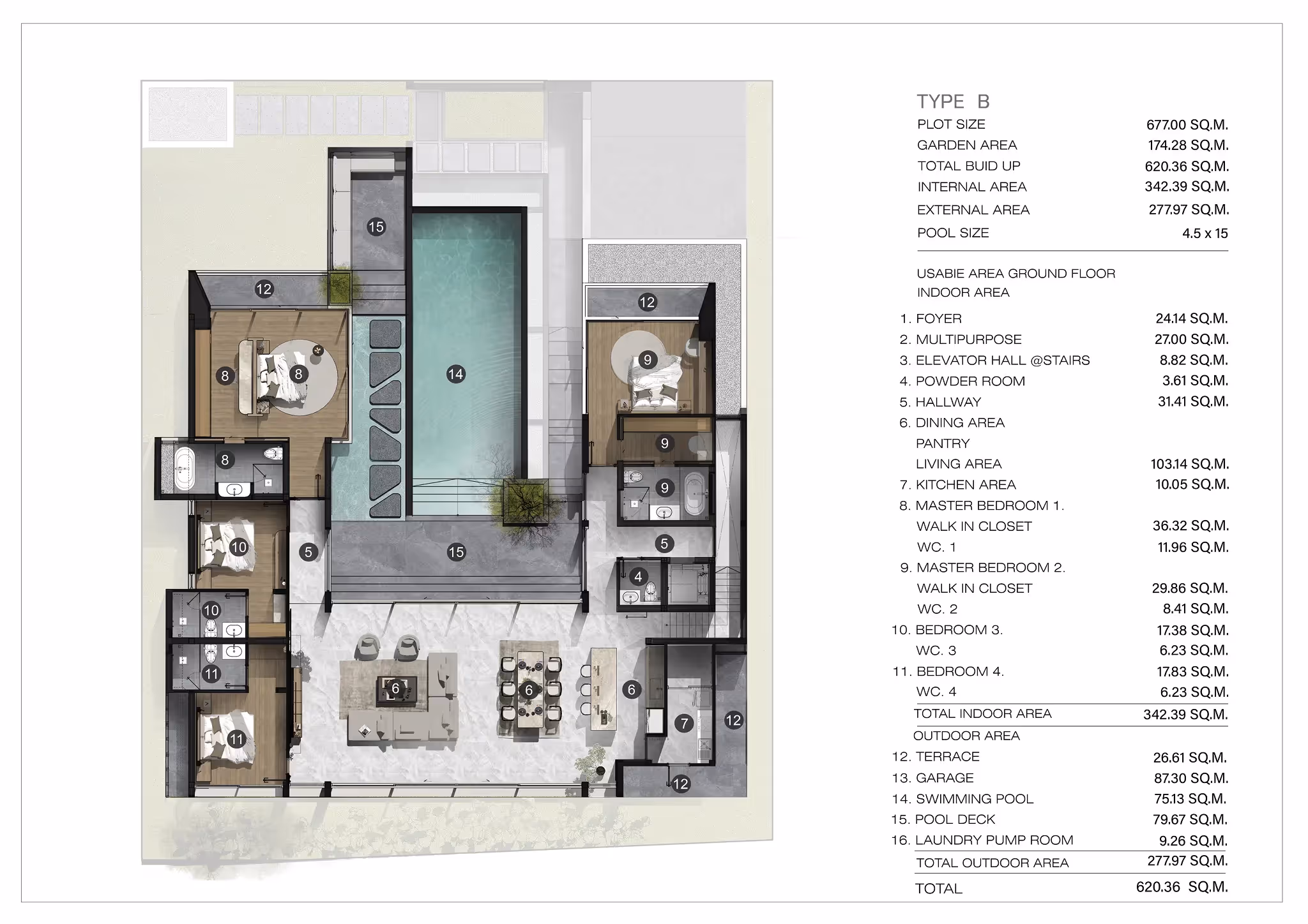 • Villa size — 507–677 sqm, each with a terrace, private pool, poolside area, and garage.