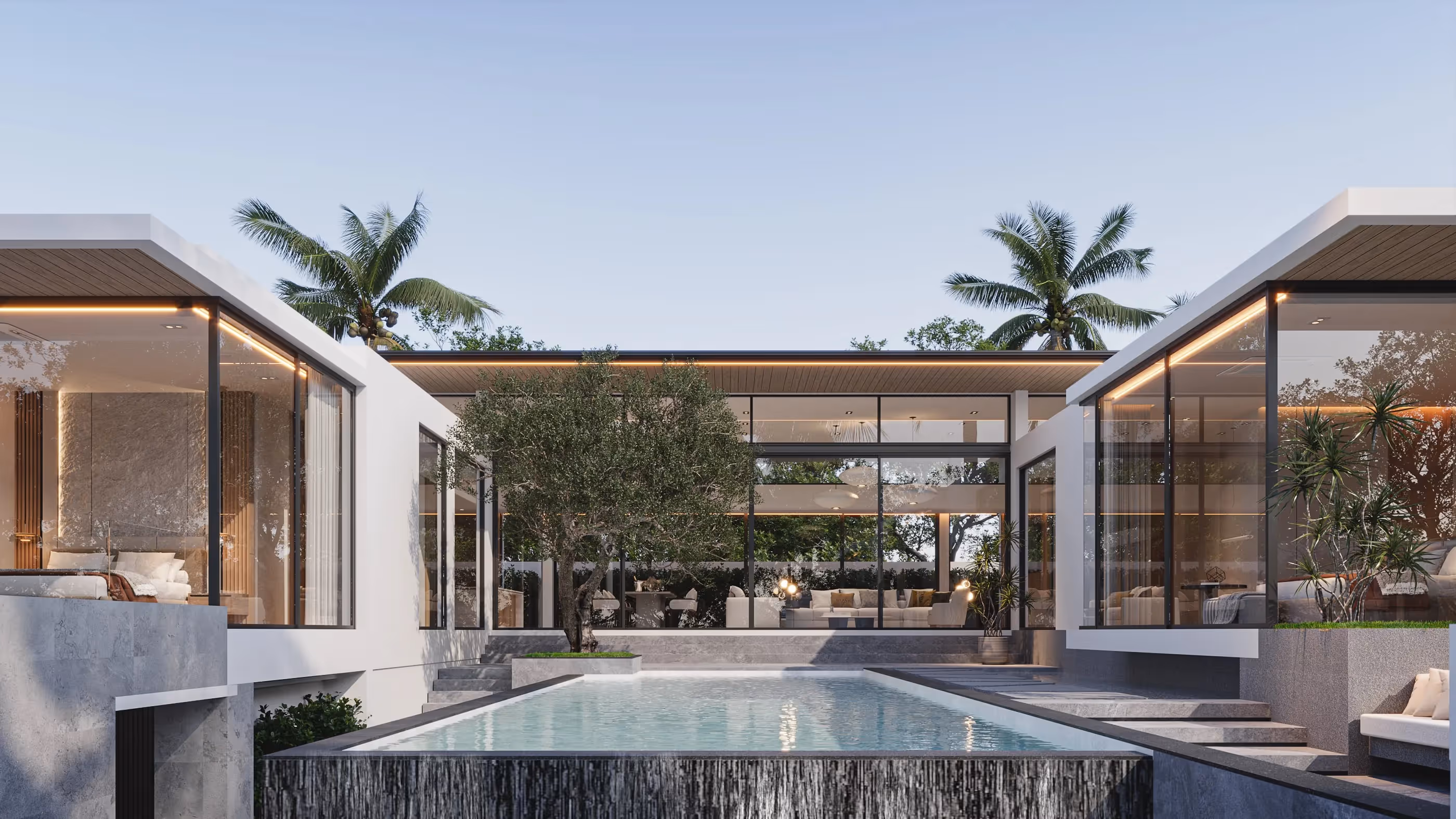 • Contemporary tropical architecture with panoramic windows, open spaces, and premium materials.
