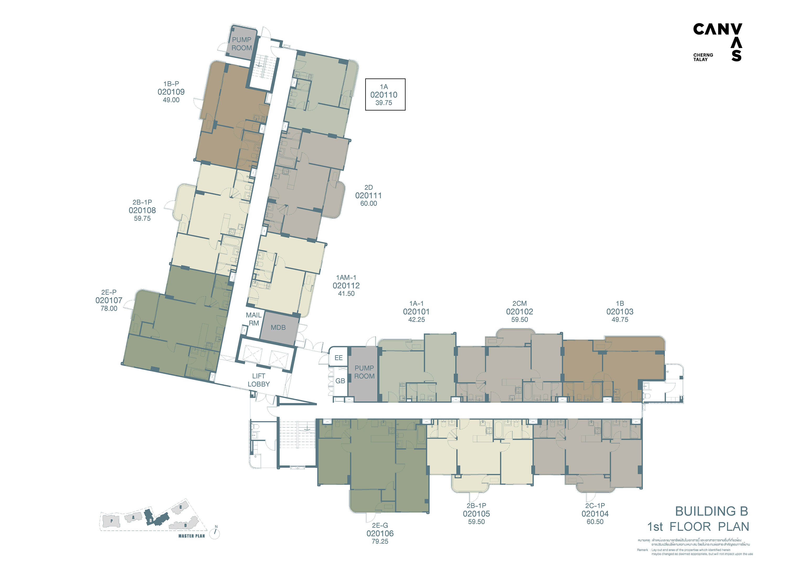 The project occupies approximately 6 rai (~9,600 m²) and consists of 4 residential buildings plus a dedicated parking building, with a total of 175 units. Layout types include: